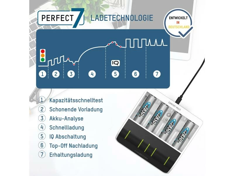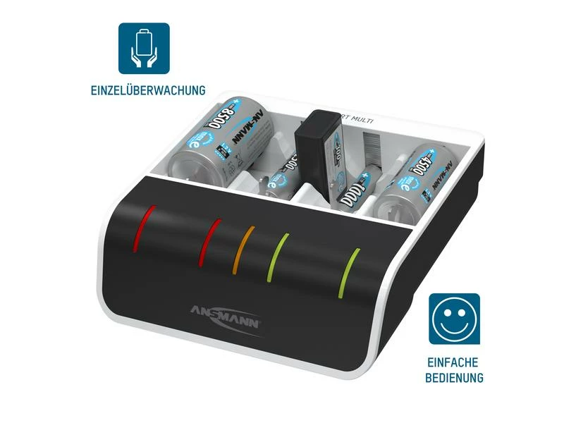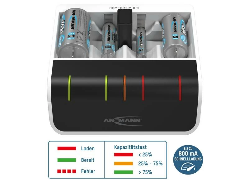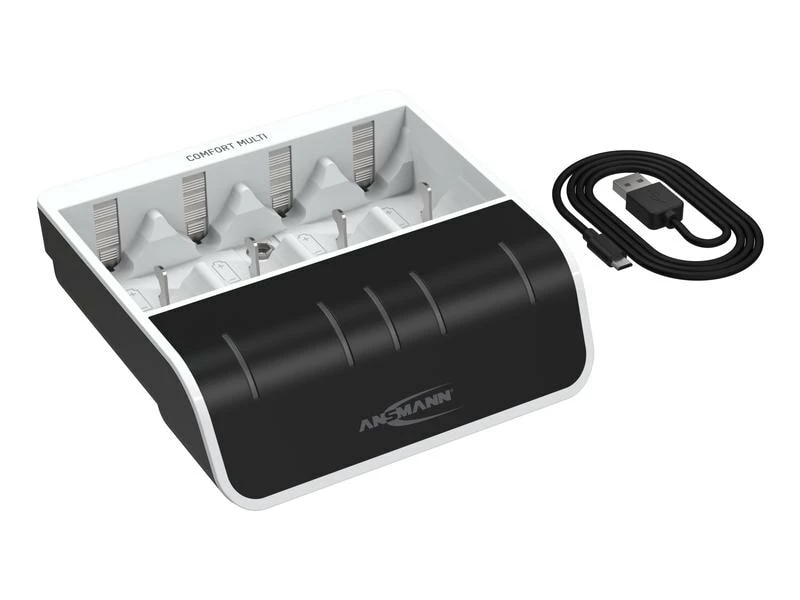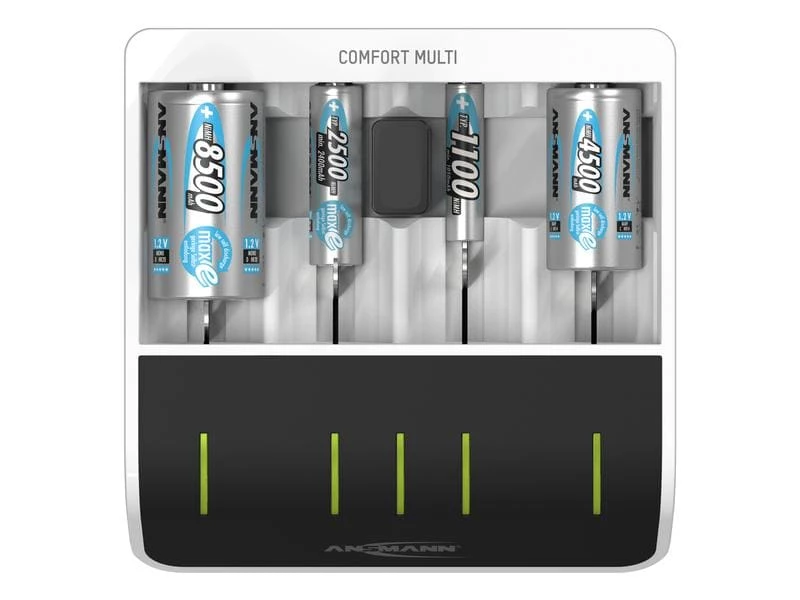 Das Ansmann Comfort Multi kombiniert die Funktionen eines universellen Ladegerätes mit jener einer professionellen Teststation. Das intelligente Schnellladegerät kann bis zu vier AA- oder AAA-Akkus laden und testen. Das Ladegerät versorgen Sie über einen normalen Netzanschluss.