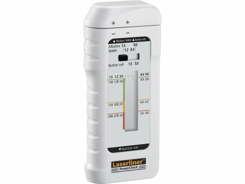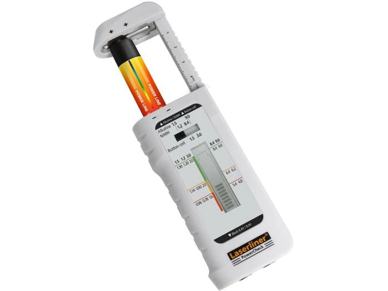 Mit dem PowerCheck lässt sich der Ladezustand von Batterien und Akkus überprüfen. Das Gerät eignet sich für alle gängigen Batteriesysteme wie Alkali, Lithium oder Zink-Kohle und kann darüber hinaus auch bei wiederaufladbaren Modellen genutzt werden. Über die stufenlos verschiebbare Batterieaufnahme lässt sich die zu prüfende Batterie schnell in das Gerät einsetzen. Das Ergebnis der Prüfung wird mithilfe einer dreistufigen LCD-Skala angezeigt. Über die Messschieberfunktion ist auch eine Grössenbestimmung der Batterie möglich.